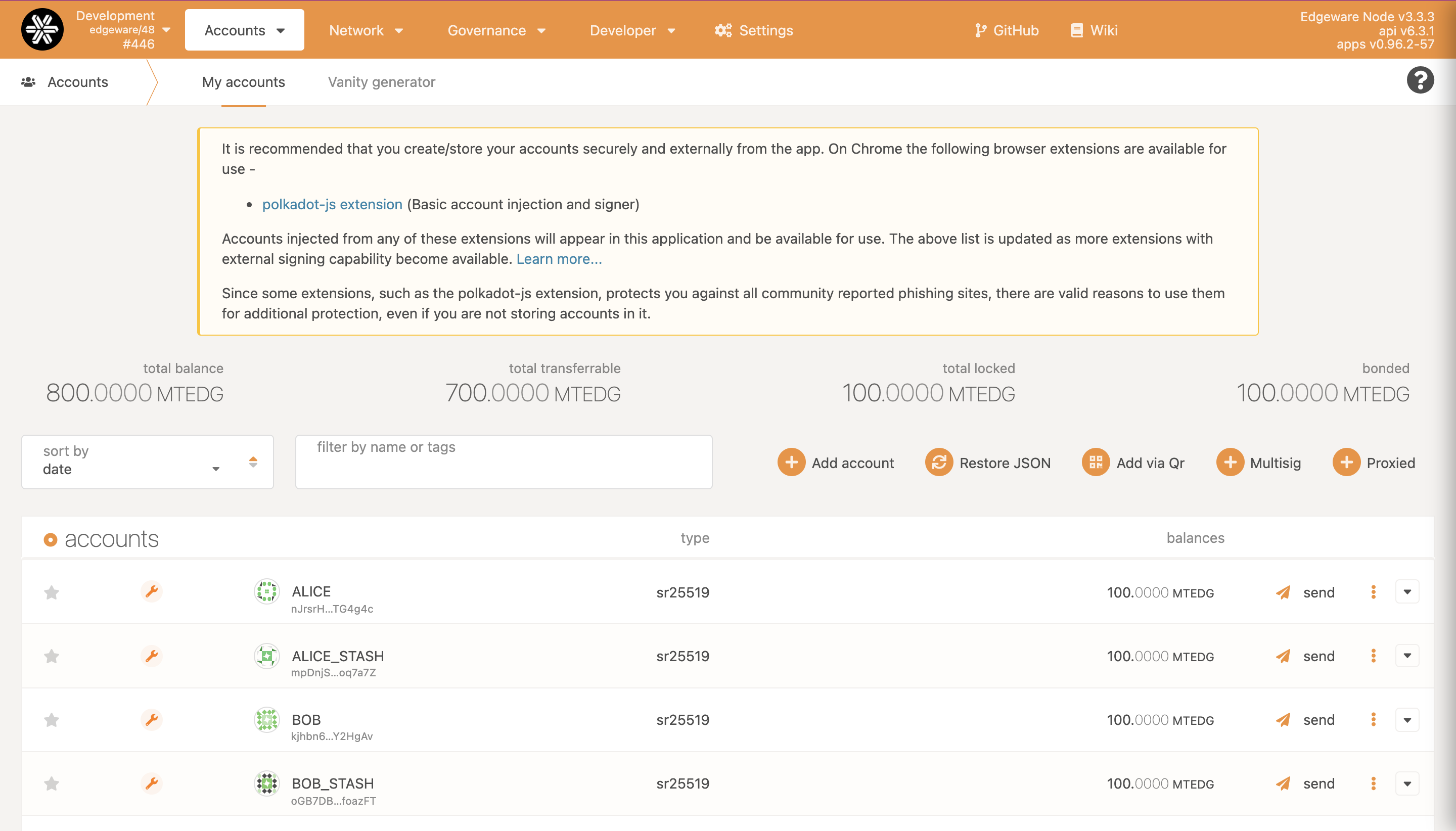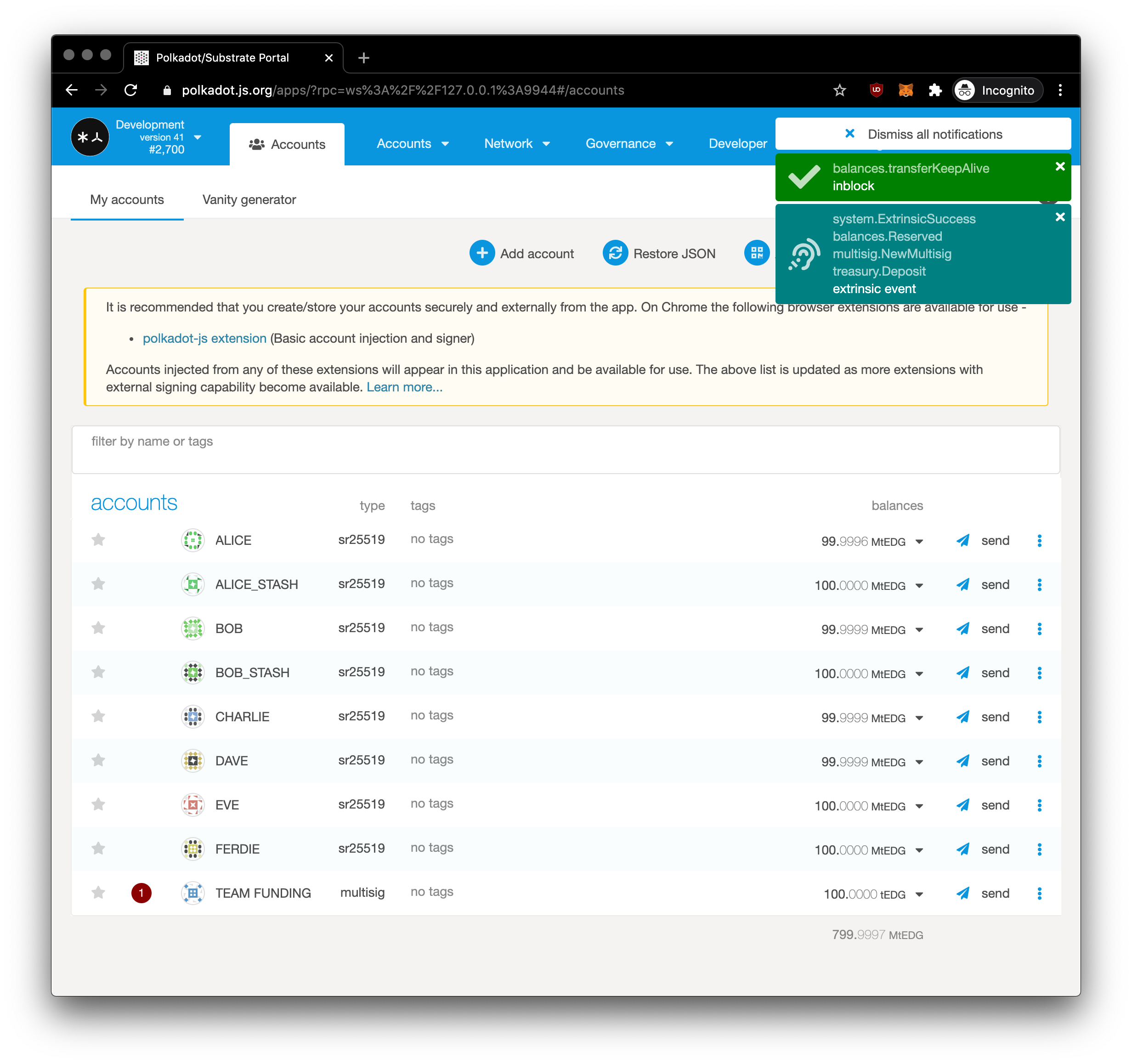 We will create a Multi-Signature account using a local Edgeware development network and perform a test transaction from the account. You will have to make sure you have a local development node running for this tutorial.