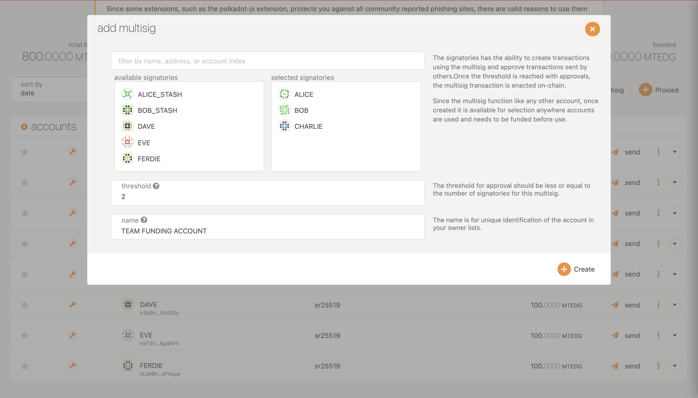 You will now choose your signatures (i.e. your teammates accounts). In our scenario, we will choose **Alice, Bob, and Charlie **and we will be setting the threshold to 2. This means only 2/3 signatures will be needed to enact the on-chain transaction. You can set the threshold to be equal to or less than the number of signatories involved in the multisig. We will name this multisig our Team Funding account.