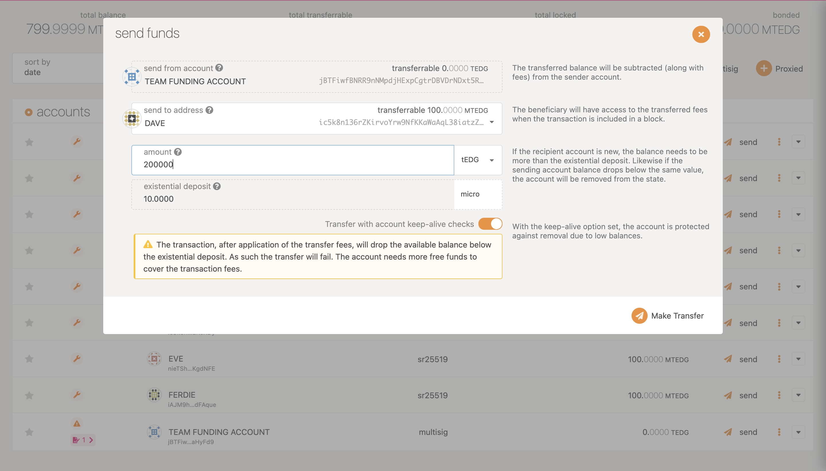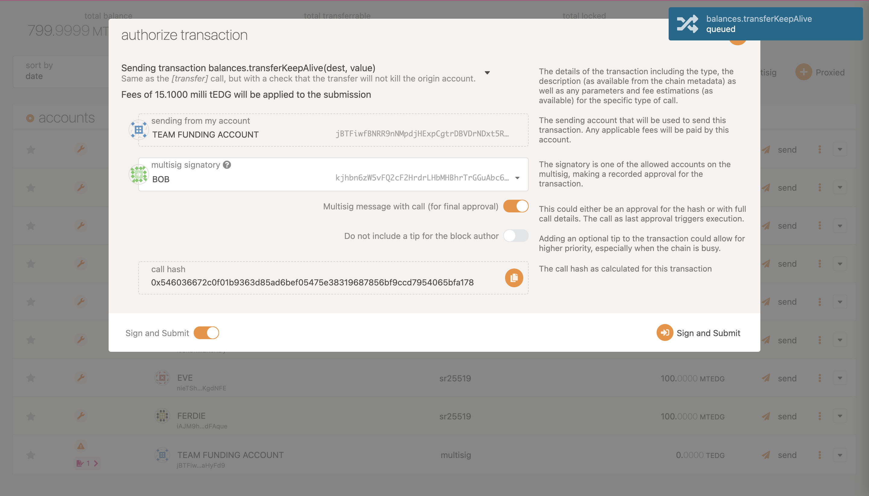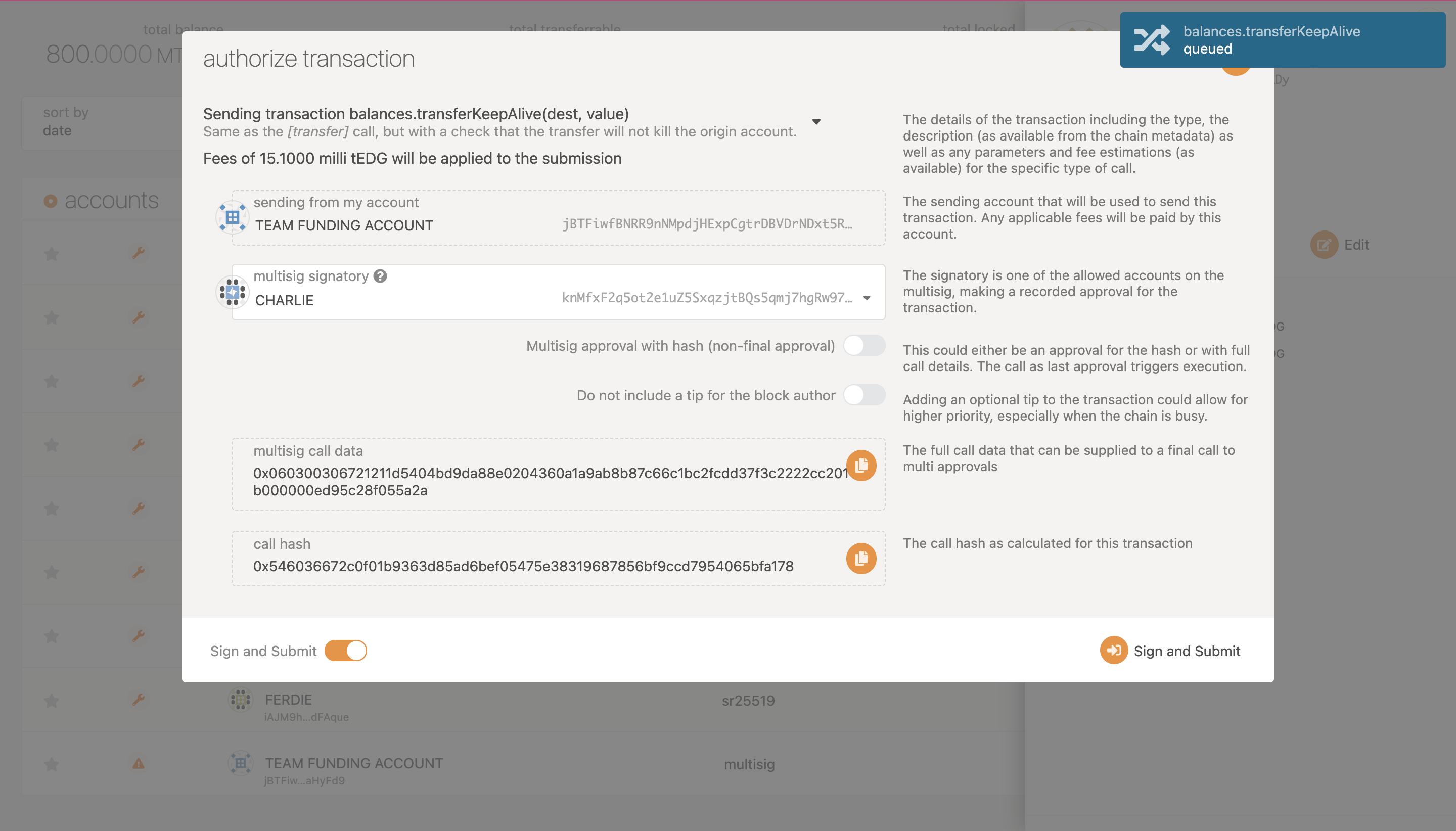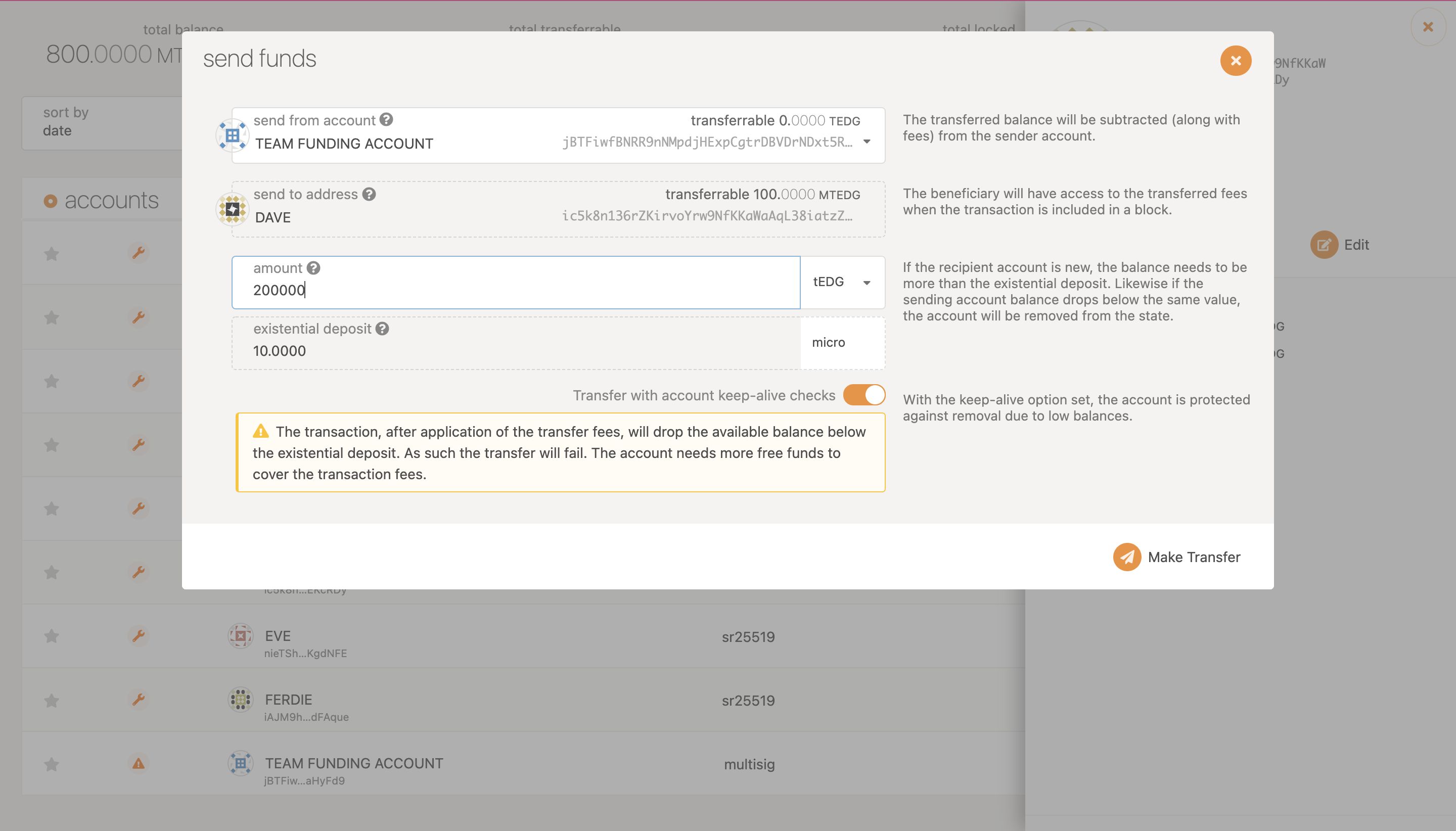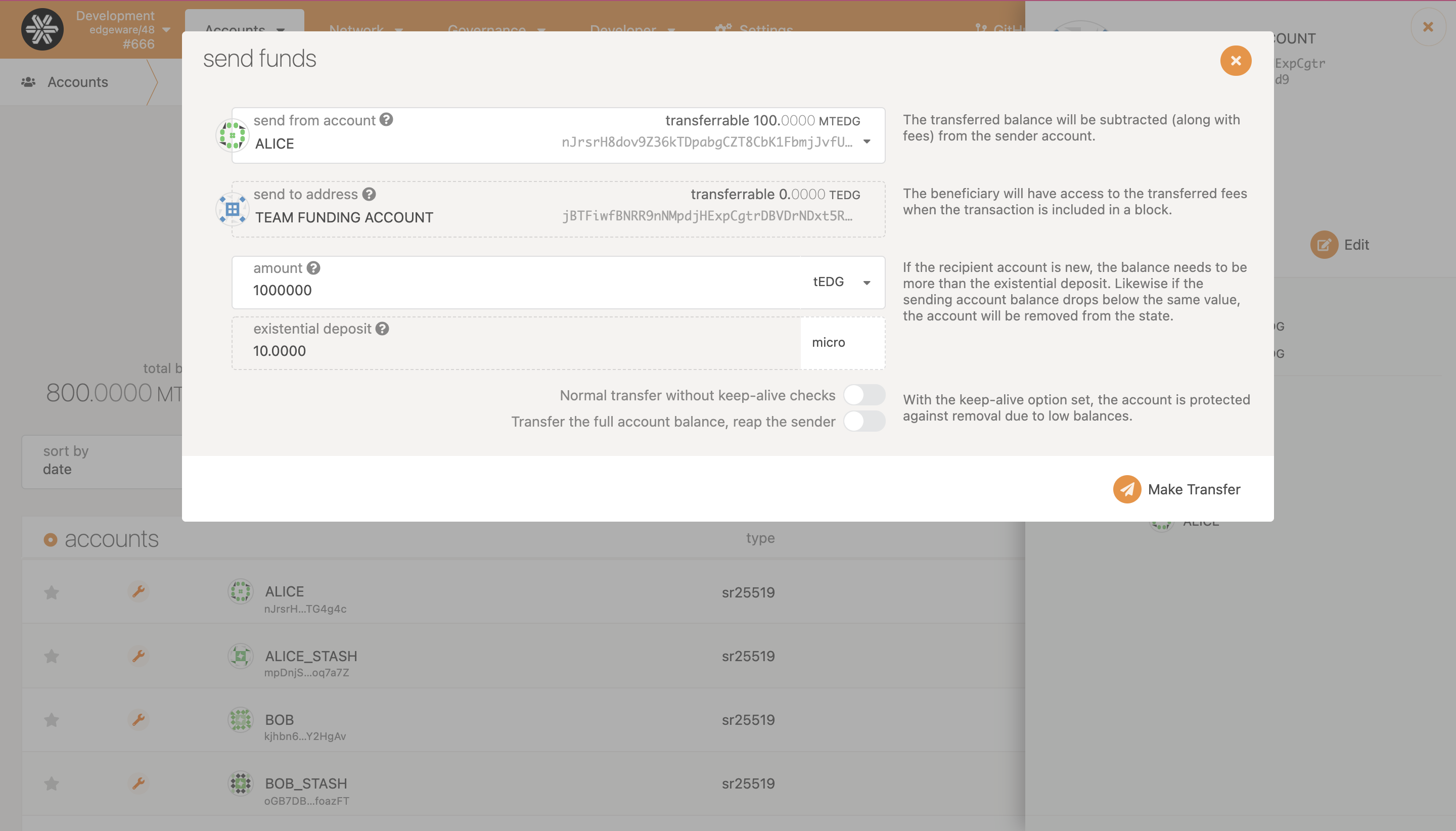 Now we will top-up 1,000,000 tEDG to the Team Funding multi-signature account from Alice. Thank you Alice!