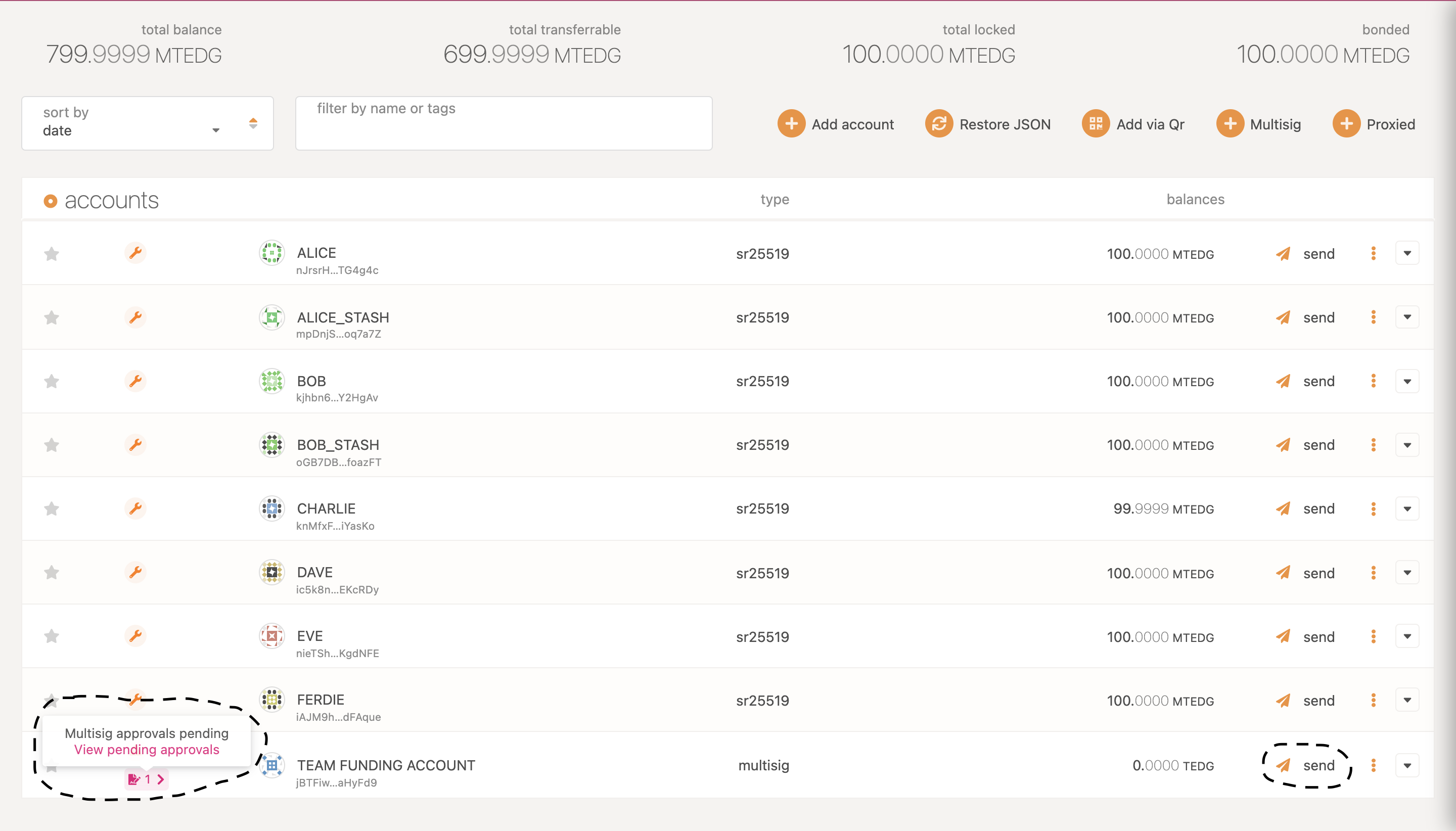 Referring to the image below, we can see the multisig approvals now pending next to our Team Funding account. On the **Team Funding **account click send.