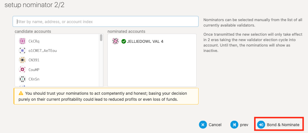 - Choose the validators you want to nominate. (You can pick more than one, in fact it is a good idea to do so. If the validator you nominated becomes inactive you will not be earning rewards. Do your due diligence when choosing validators) Want to learn more click here for a good explanation.