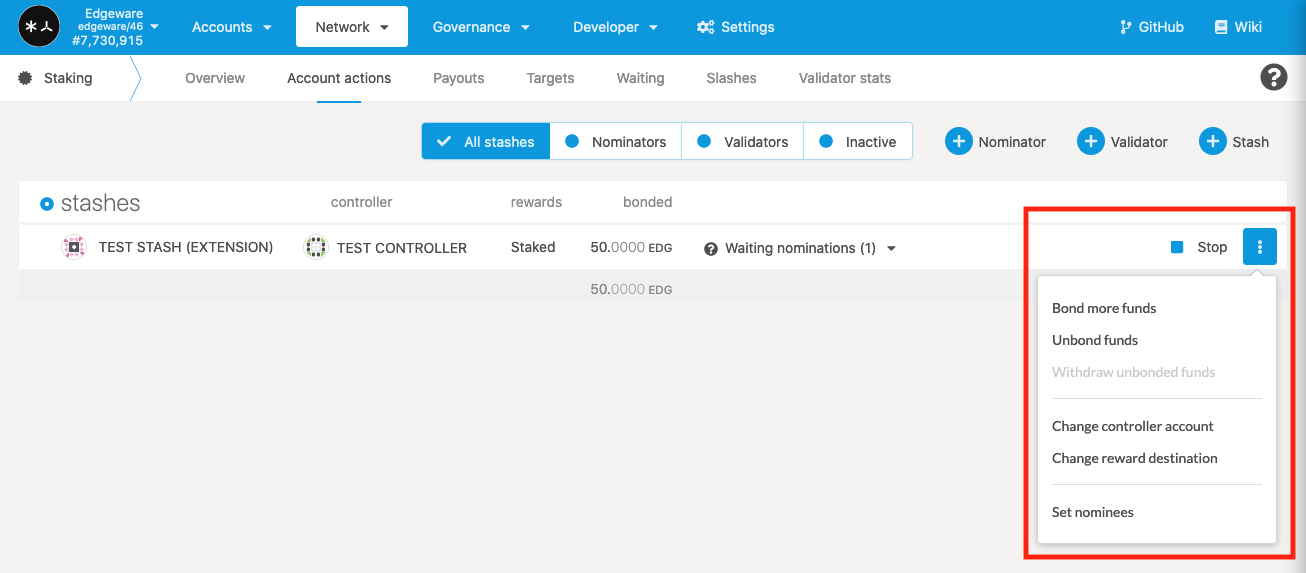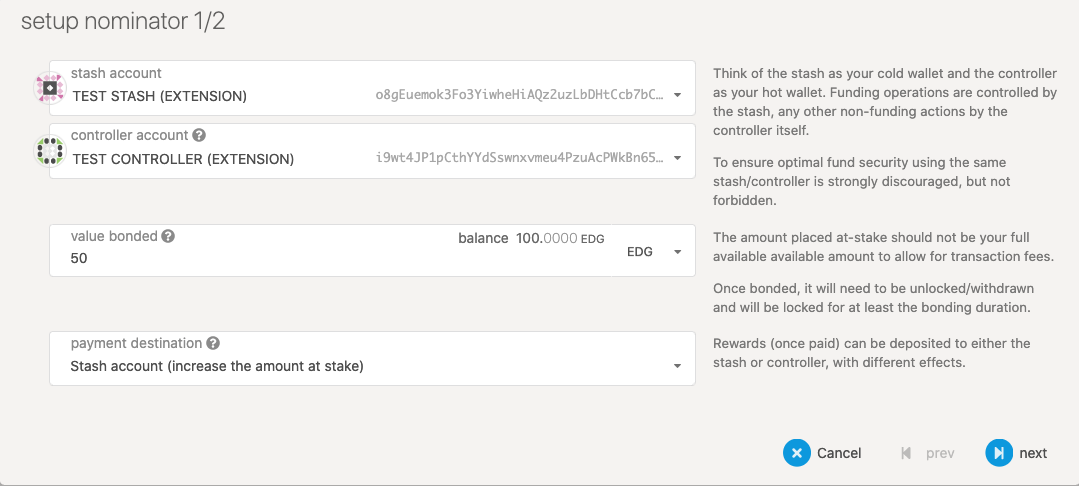 - Think of the Controller account as a hot wallet that acts on behalf of the Stash account.